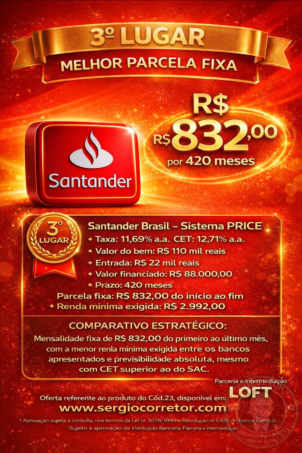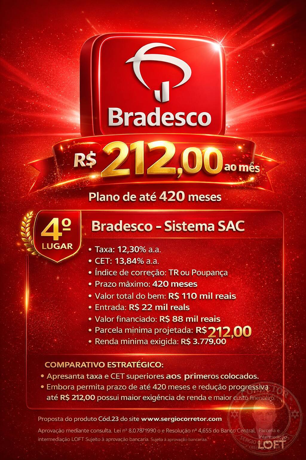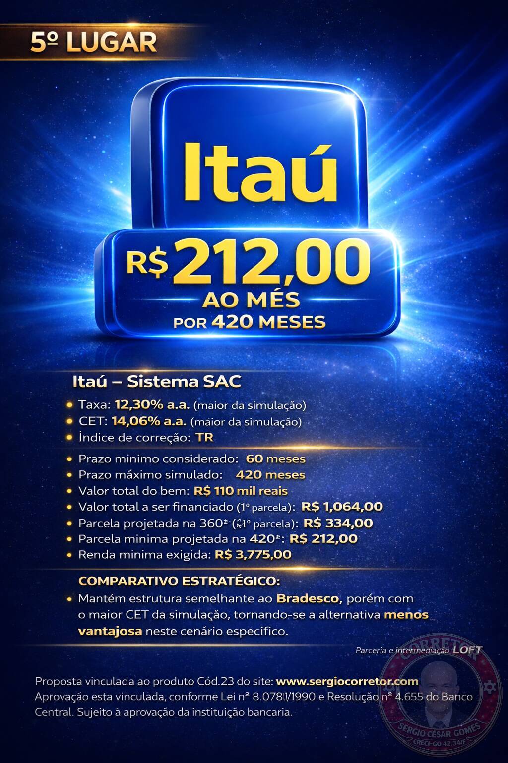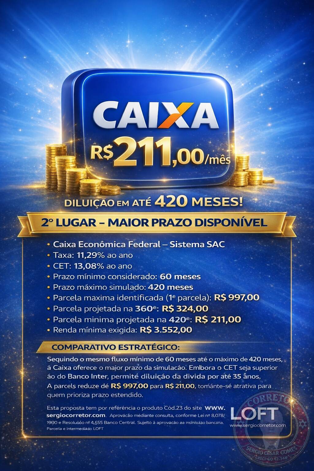 Apresenta taxa e CET superiores aos primeiros colocados. Embora permita prazo de até 420 meses e redução progressiva até R$ 212, possui maior exigência de renda e maior custo financeiro.