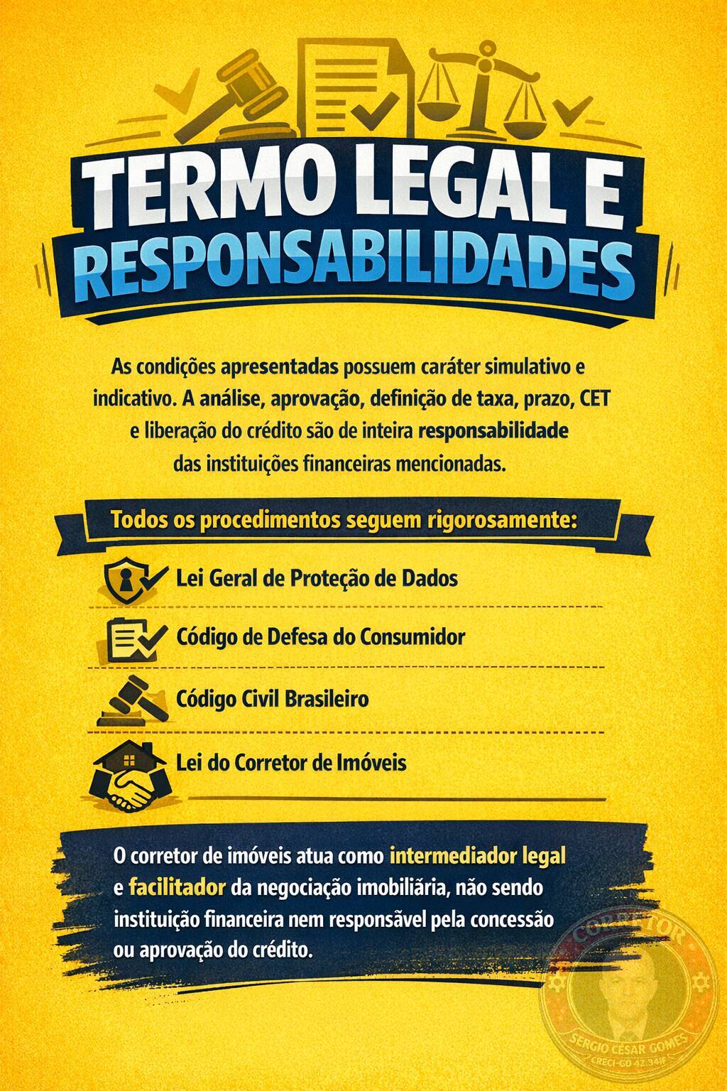 O corretor de imóveis atua como intermediador legal e facilitador da negociação imobiliária, não sendo instituição financeira nem responsável pela concessão ou aprovação do crédito.